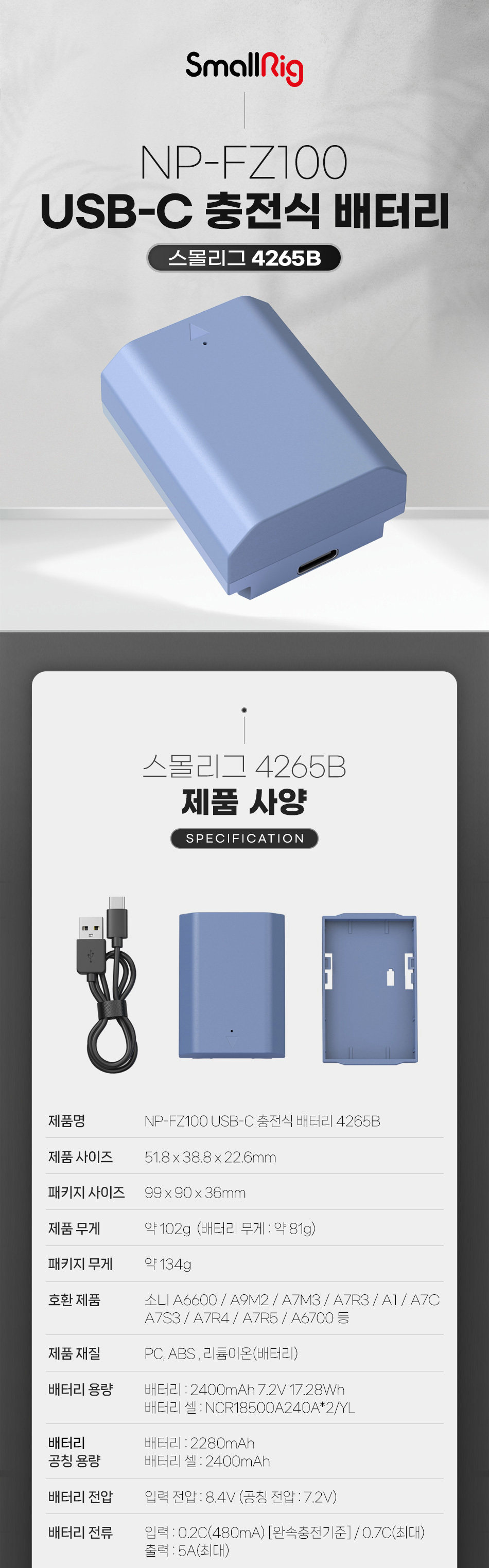 스몰리그  카메라 배터리 USB-C 충전식 KC인증 2400mAh 4265B